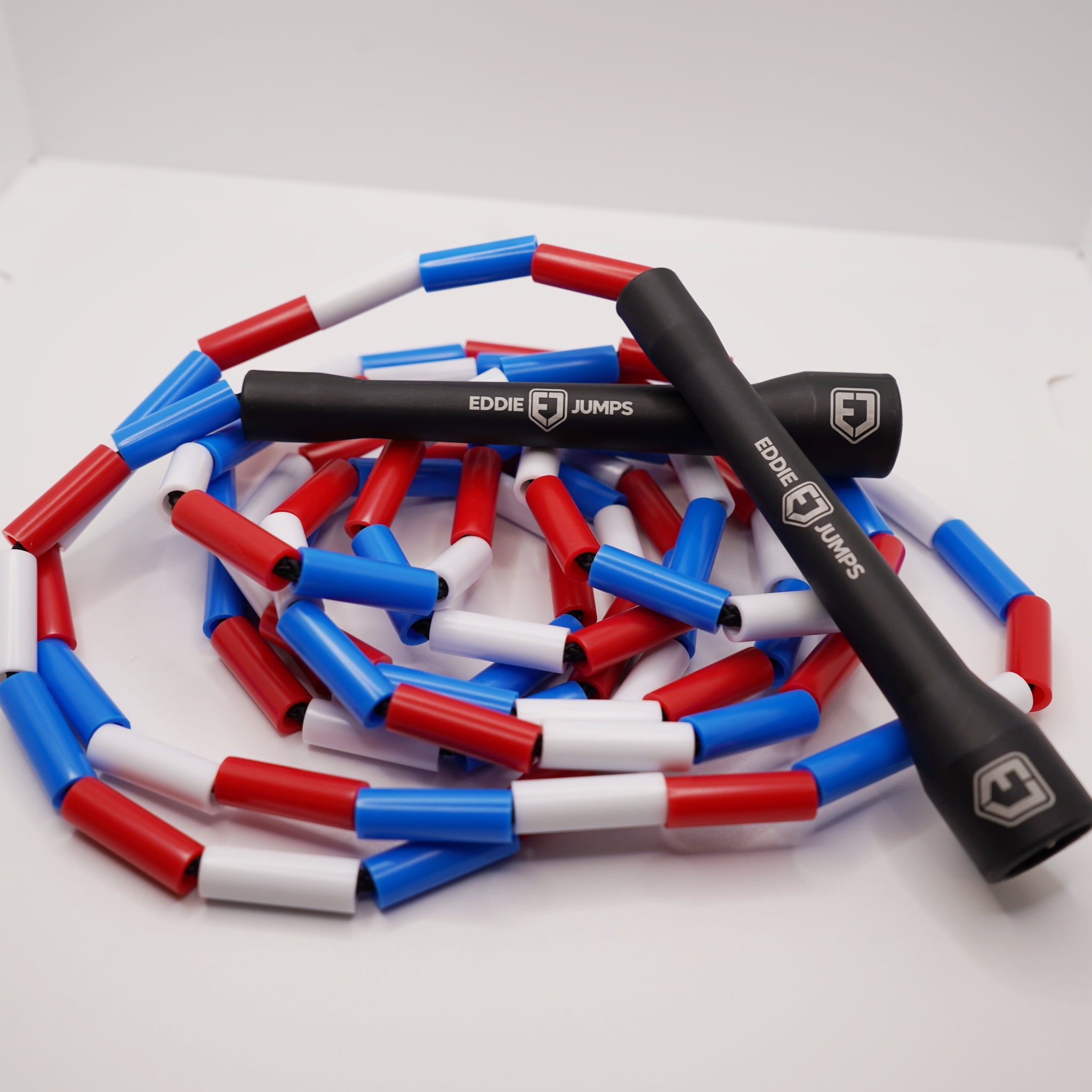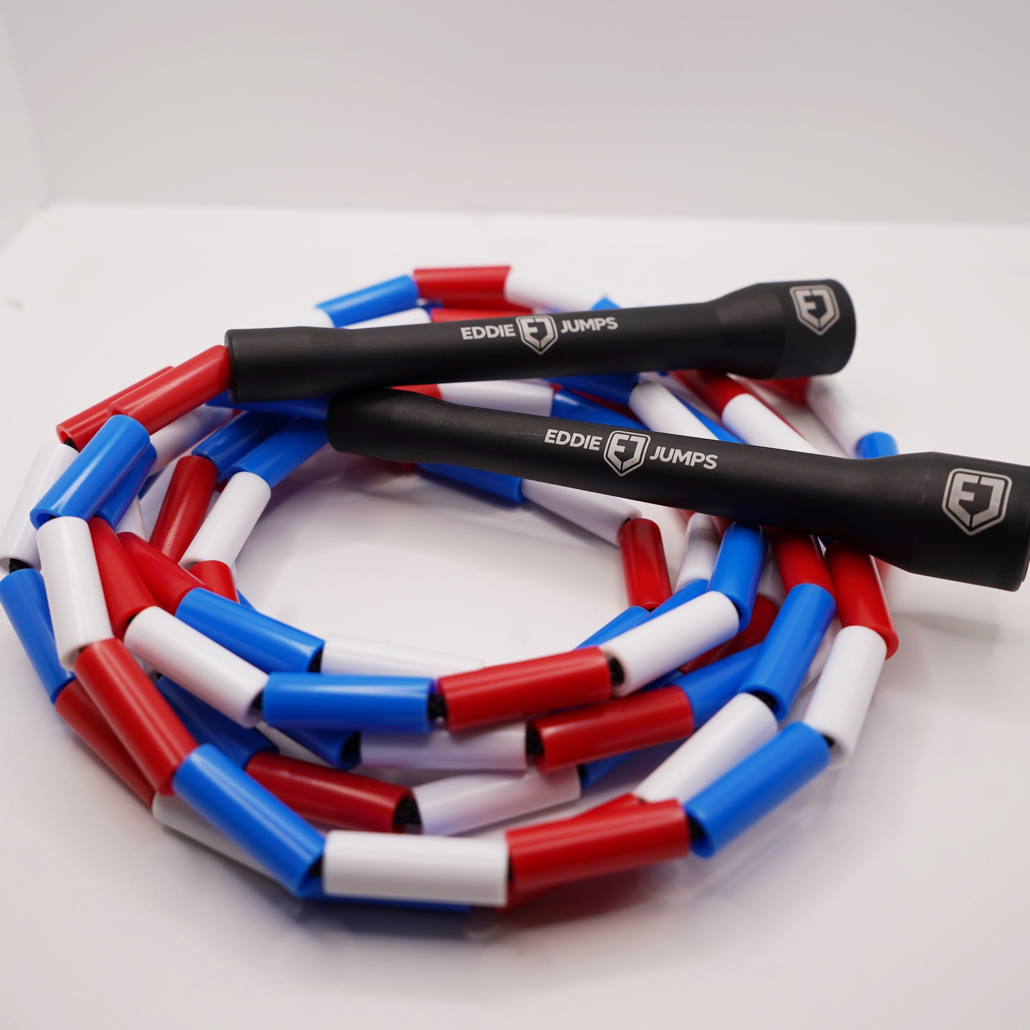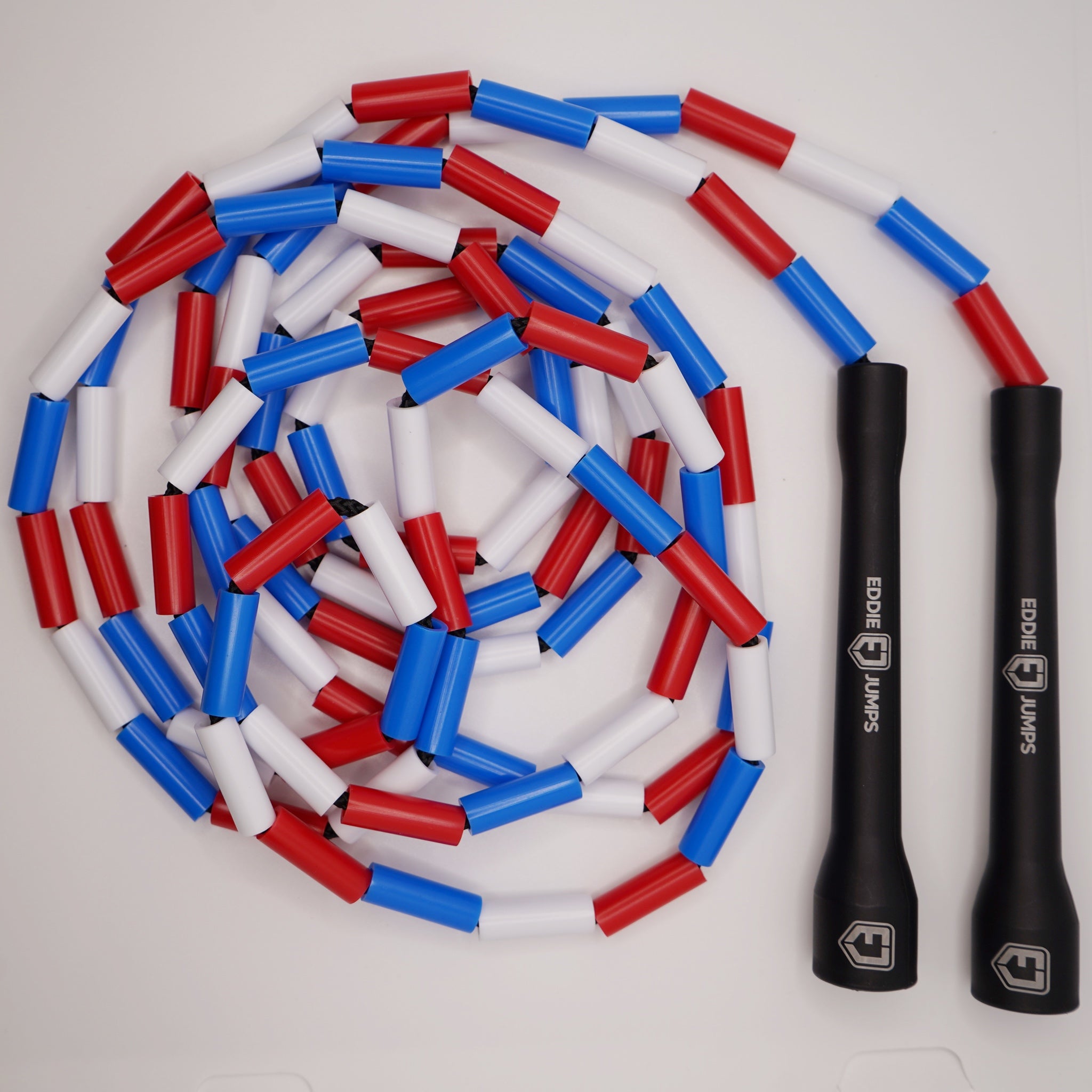 The Eddie Jumps EJ Classic Beaded Rope is where it all began. With its vibrant red, white, and blue beads and sleek black handles and cord, this iconic rope represents the perfect combination of style, quality, and performance. Designed and tested to create the ideal jump rope, the EJ Classic was built for success, making it the rope that launched Eddie Jumps into the jump rope business.